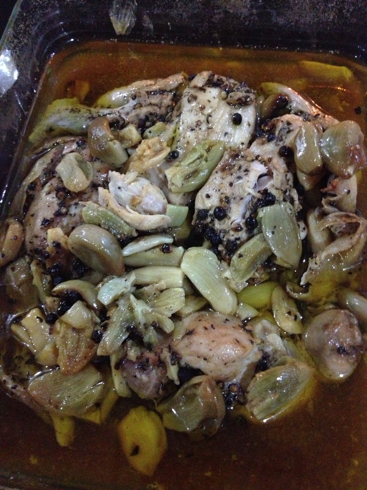 Since I used a deboned chicken, our suki was able to give us one that had the skin intact.  I don’t know how he did it, but imagine a whole chicken without the bones.  I didn’t need to sew anything shut anymore!  I just placed the garlic (a ton of them) and insterted the lemongrass.  I think it exploded while it was baking because this is what happened.  I will use chicken with bones on my next try!  Hehehe..