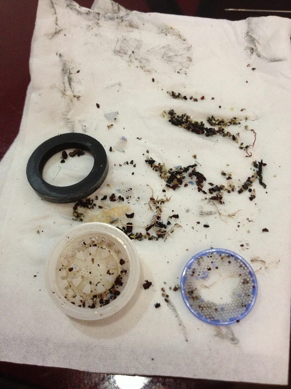 I had to clean them right? But then, look at the filter with the round blue thing – it was destroyed! And to think that it was – plastic! Here are the debris – dirt, plastic and all..