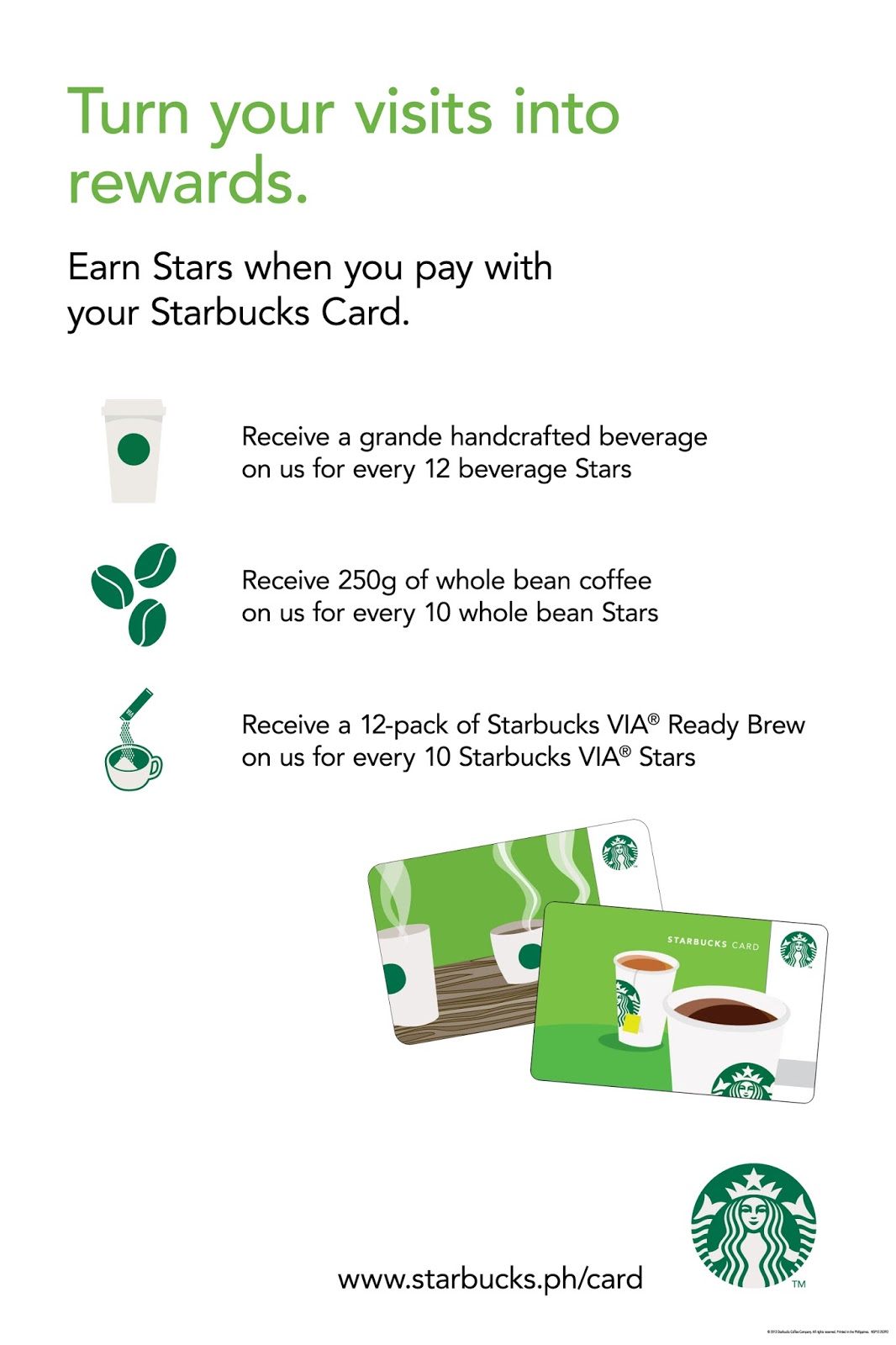 Starting tomorrow – August 7, these babies will be available in ALL Starbucks stores nationwide. You’d need to purchase a card for P300.00, this card is already loaded with a peso value of P300.00 that you can use to purchase beverages, food items and merchandise! You can reload it at ANY Starbucks store nationwide. What’s great about it is that – you can earn stars (loyalty points) for every purchase of handcrafted beverages, coffee beans and VIA ready brews. The stars that you earn – can be redeemed as follows: