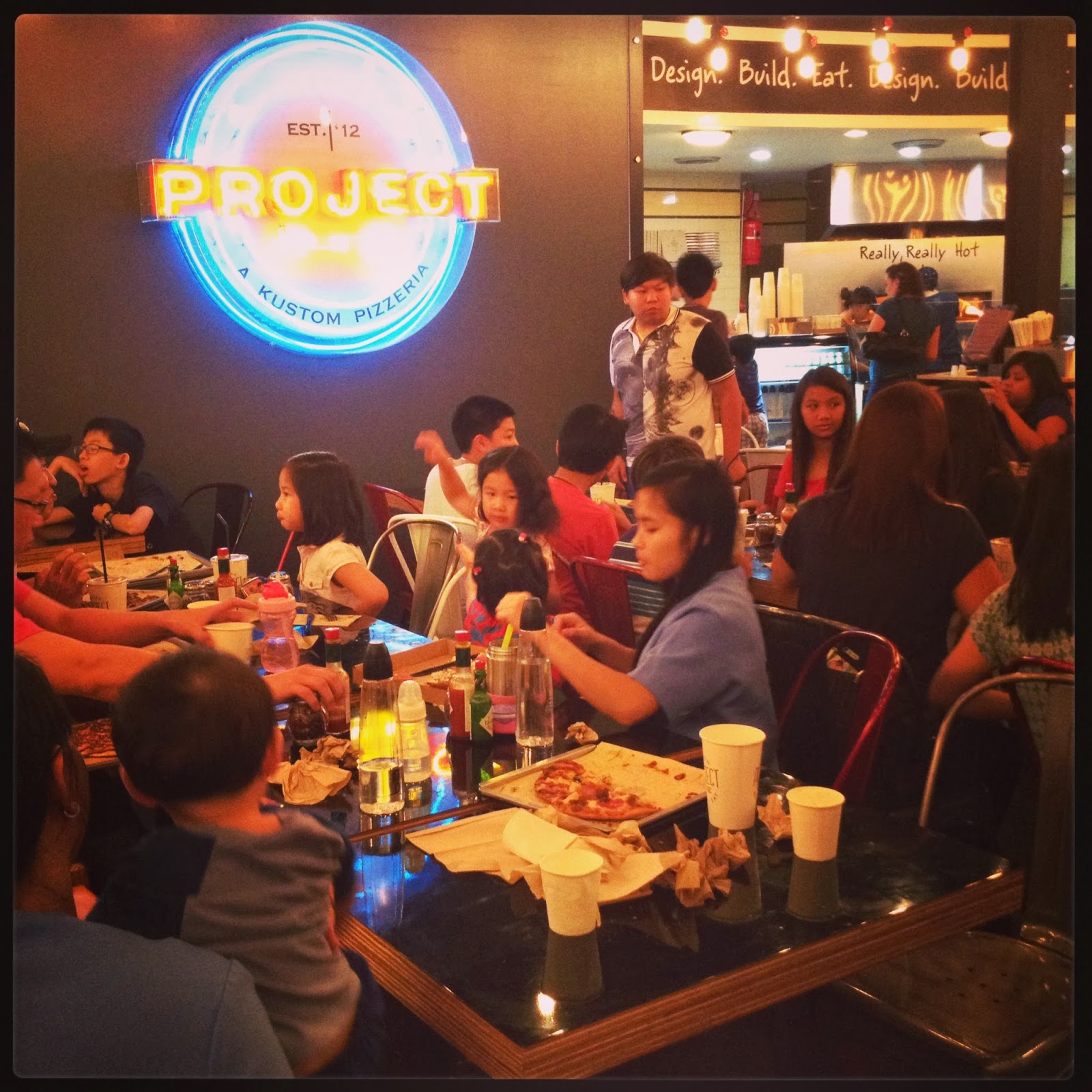 When we finally got our table (thanks to the much lingering of patrons, who were taking selfies BTW) I stood in line for like forever. Why? Well, because since the slogan says Design, Build, Eat. And that was what exactly happened. You are to design your own pizza, build it as you like and chomp chomp away. The line took long because of course considering we had 10 mouths to feed, it was a simple math of ordering at least 7 pizzas – and that’s with the thought of trying to build you own 7 pizzas! Madness! Hahaha.. I found that it might take long, and hungry patrons standing in line behind us might kick our ass (as I would if the patrons ahead of me would take their sweet time) and so I thought, I’d just order 2 pizzas with ready made designs and 2 that is build your own. So there, in a span of 10 minutes we were done. The pre-designed/template pizzas were easy, but the build your own, well it took a bit more time. I wish there was a sign that says Step 1: Choose your Sauce (red or olive oil) Step 2: Choose your cheeses, Step 3: Choose your meats Step 4: Choose your veggies. Because for a first timer like me, I was looking at the Project Pie flyer and the cheeses were way at the end of the list of ingredients. So instead of telling them what the cheese, I first told them the meats. It was very confusing to be honest. My brother in law suggested that there be a flyer with a box to be ticked for faster transactions, oh well. I found it funny that the pizza’s topping were all supposed to be written on the ‘paper’ to label the pizzas, maybe because in the end if a customer claimed this and that on their pizzas – if its written, then no more contesting!