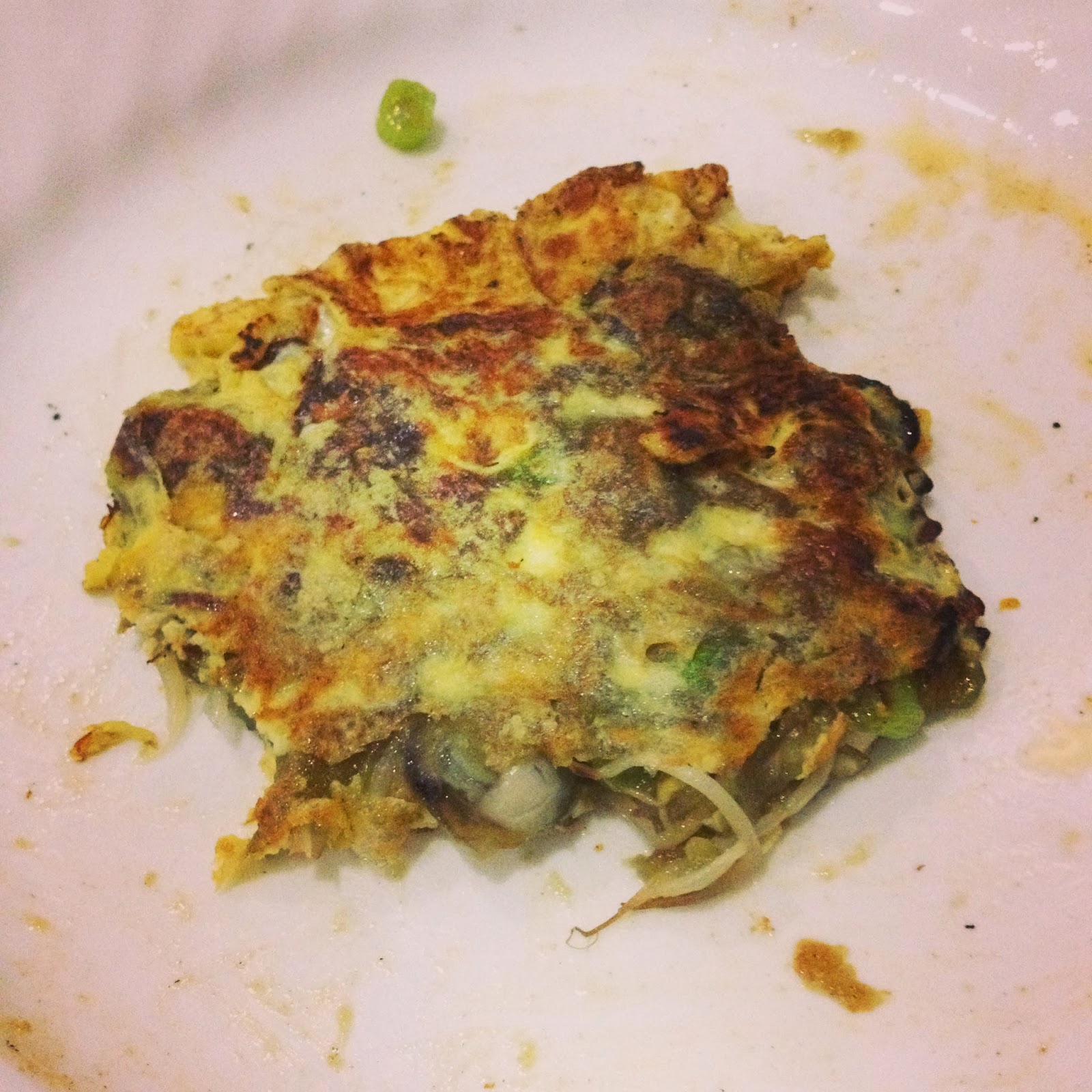 Okay – since I just experimented what I did was just to throw everything in and mix it.  Mix together the cleaned oysters, bean sprouts, leeks, tapioca starch and salt and pepper.  Mix thoroughly.  Use a non-stick pan for easier handling, heat and when you see the smoke come out from the pan, pour the mixture.  Cook until golden brown and flip over.  You can cook it longer to make it more crispy but make sure you are using the correct heat setting so as not to burn the oyster cake.  You may add the scrambled egg when it cake is golden brown.  I honestly preferred it without the egg, but I guess the egg is an extender of some sort.